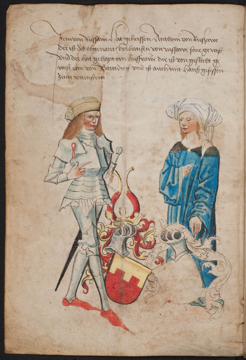 Ahnenpaar im 1491 begonnenen Geschlechterbuch der von Rossau. (Württembergische Landesbibliothek Stuttgart, Handschrift Cod. hist. qt. 420, Blatt 1v)