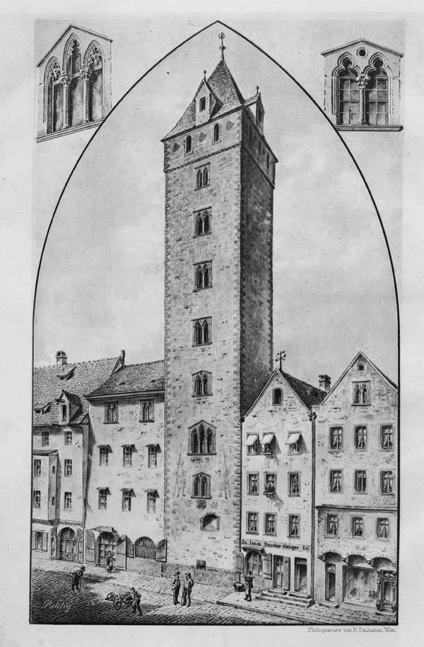 Der Goldene Turm in Regensburg, Photogravure. (Abb. aus: Carl Theodor Pohlig, Hauskapellen und Geschlechterhäuser in Regensburg, Regensburg 1890, Vorsatzblatt)