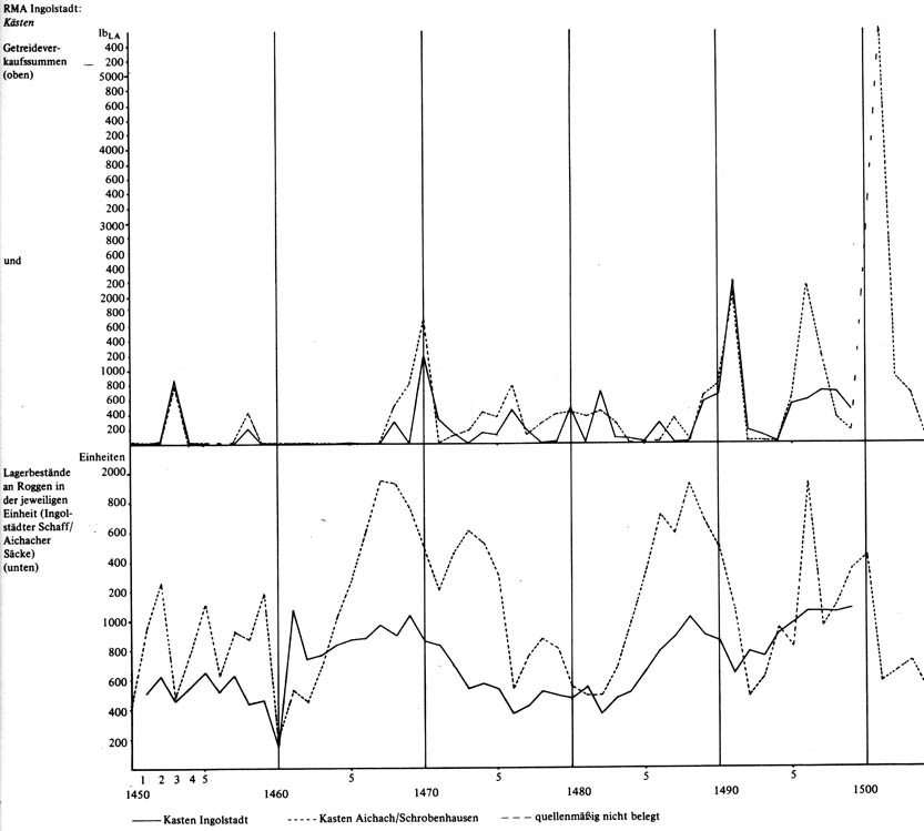 Lagerbestände an Roggen in den Kästen Ingolstadt und Aichach/Schrobenhausen sowie die jeweiligen Getreideverkaufssummen [in Pfund Landshuter Währung] von 1450 bis Anfang des 16 Jahrhunderts [aus: Ziegler, Studien zum Staatshaushalt, München 1981, S 509, Zeichnung14]