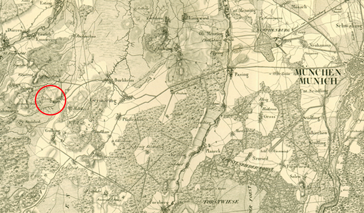 Alling [rot umkreist], die Münchner Schotterebene und die Stadt München [rechts] auf der topographischen Carte de la Bavière, aufgenommen 1801 bis 1806 [L Aubert/Charles Rigobert Marie Bonne, Carte de la Bavière, [Paris1900]]