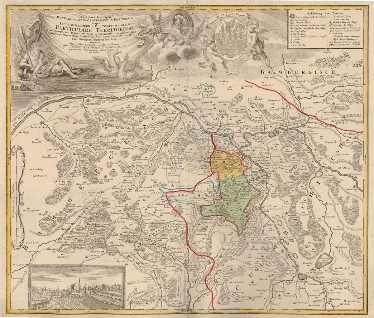 Das Giech'sche Territorium um 1710. Die Karte von Johann Baptist Homann (1664-1724) stellt den Giech'schen Hochgerichtsbezirk in Flächenfarben dar und zeigt den weiteren Streubesitz. Die von der Karte suggerierte Geschlossenheit der Giech'schen Besitzungen führte zu Streitigkeiten mit den Künßberg, mit denen damals noch ein Kondominat bestand. (Geographica Descriptio Montani Cuiusdam Districtus In Franconia in quo Illustrissimorum S R I Comitum a Giech Particulare Territorium, Nürnberg o. J.)
