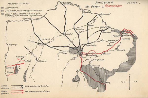 Anmarsch der bayerischen und österreichischen Truppen. (aus: Wilhelm Erben, Die Schlacht bei Mühldorf. 28. September 1322. Historisch-geographisch und rechtsgeschichtlich untersucht [Veröffentlichungen des Historischen Seminars der Universität Graz 1], Graz u. a. 1923, 87)