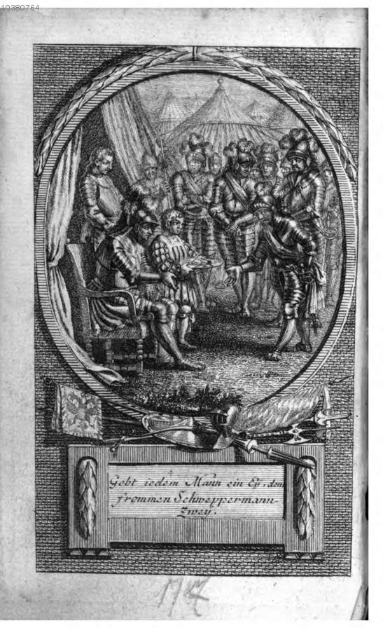 Kupferstich der Schweppermann-Legende von Johann Michael Mettenleiter (1765-1853), 1787. (aus: Lorenz Westenrieder, Baierisch-historischer Calender oder Jahrbuch der merkwürdigsten baierischen Begebenheiten alt- und nueer Zeiten für 1787, München 1787, Frontispiz)