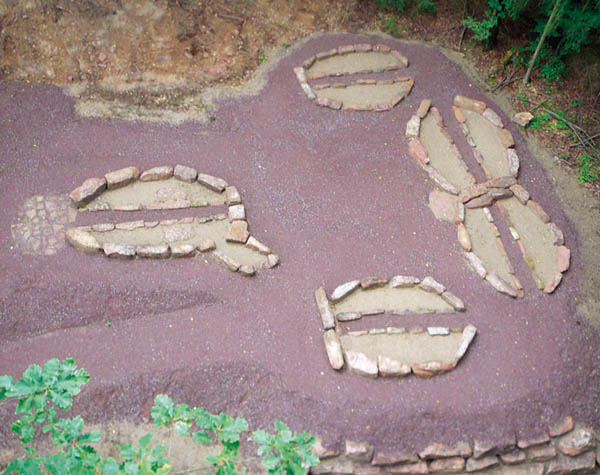 Luftbild der rekonstruierten Fundamente der Glasöfen der Epsteinhütte im Oberen Kahlgrund. (Archäologisches Spessart-Projekt)