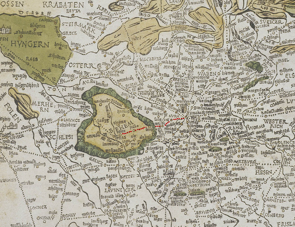 Die Straßenkarte von Erhard Etzlaub [1462-1532] zeigt noch die nördliche Route über Weiden und Bärnau [rote Markierung durch die Redaktion] [Germanisches Nationalmuseum, Inv Nr La 217 Kaps 1036a]
