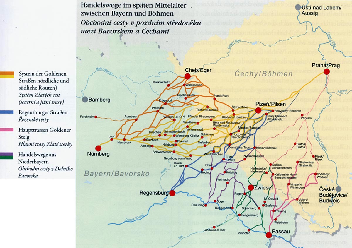 Der Goldene Steig im Kontext der spätmittelalterlichen Handelswege zwischen dem fränkisch-bayerischen Raum und Böhmen. (© Haus der Bayerischen Geschichte; Konzeption: Ulrich List, München; Grafik: Heinz Muggenthaler, Regen. Die Karten unterliegen dem Urheberschutz)