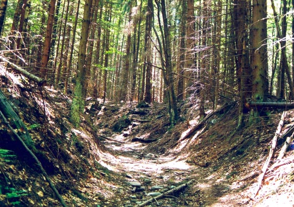 Hohlweg. Ehemalige Straßenführung am böhmischen Teil des Bergreichensteiner Zweiges des Goldenen Steiges im sog. Haidler System, nördlich von der verschwundenen Ortschaft Haidl (Zhůří). (Foto: Petr Zavřel, Prachatické muzeum)