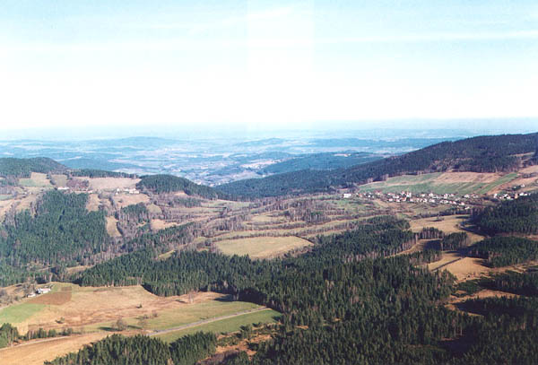 Die Luftaufnahme zeigt zwei Routen des Prachatitzer Zweiges des Goldenen Steiges: zum einen von Albrechtovice - (Albrechtschlag) links unten schräg durch den Hang zum Bergsattel oberhalb von Prachatice (die Stadt liegt versteckt unterhalb des Bergsattels), zum anderen entlang der Straße unten im Bild zur Ortschaft Libínské Sedlo (Pfefferschlag) rechts in der Mitte (Tschechische Republik). (Foto: Jaromír Beneš, Prachatické muzeum)