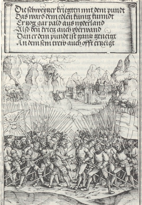 Darstellung des Schabenkriegs in der Ehrenpforte Kaiser Maximilians I, einem monumentalen Holzschnittwerk zur Inszenierung seiner Kaiser- und Reichsidee Holzschnitt von 1515 [aus: Niederhäuser/Fischer, Vom Freiheitskrieg zum Geschichtsmythos,87]