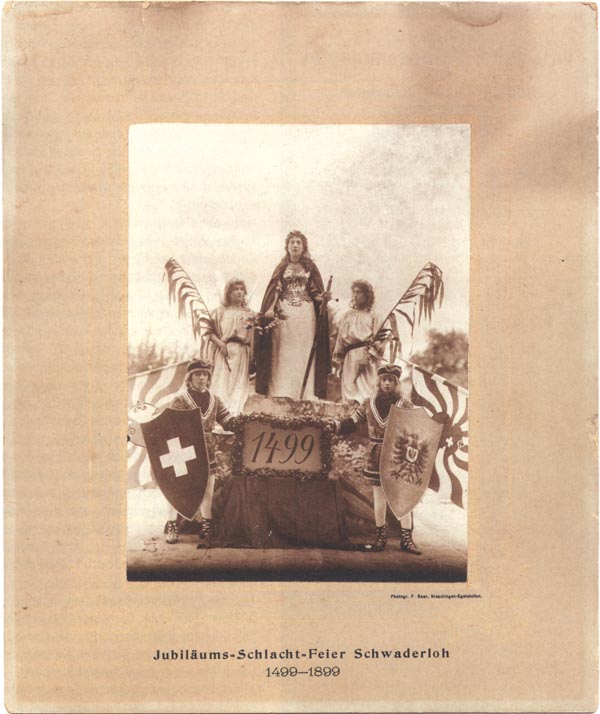 Schlussbild des grossen vaterländischen Volksschauspiels von 1899 zum Gedenken an den Schwabenkrieg: eine Apotheose der Helvetia [aus: Schwabenkrieg - Schweizerkrieg 1499 Konstanz und Thurgau - getrennt seit 500 Jahren,73]