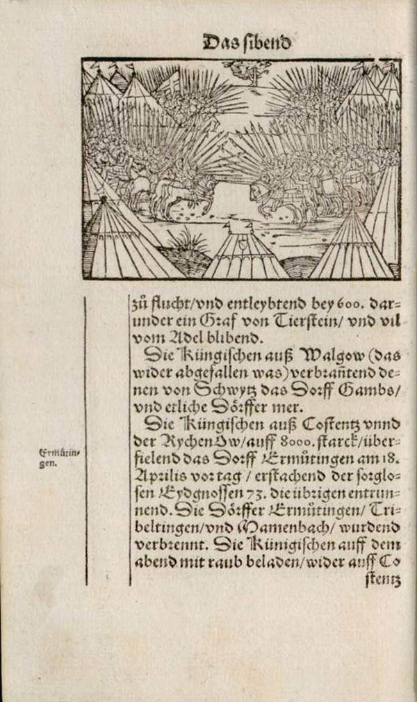 Die Schlacht am Bruderholz in der Schwytzer Chronica des Johannes Stumpf [1500-1574], Zürich 1554 [Bayerische Staatsbibliothek Res/Helv 705, VD16 S 9866, fol254v]