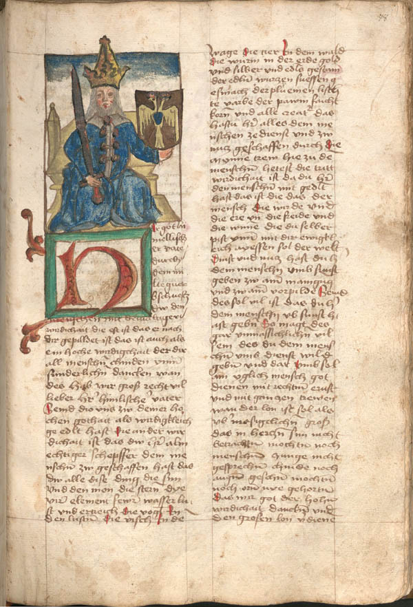 Thronender Kaiser mit Wappenschild; Beginn des Landrechtsbuches, 1475. (Bayerische Staatsbibliothek, Cgm 216, fol. 78r)