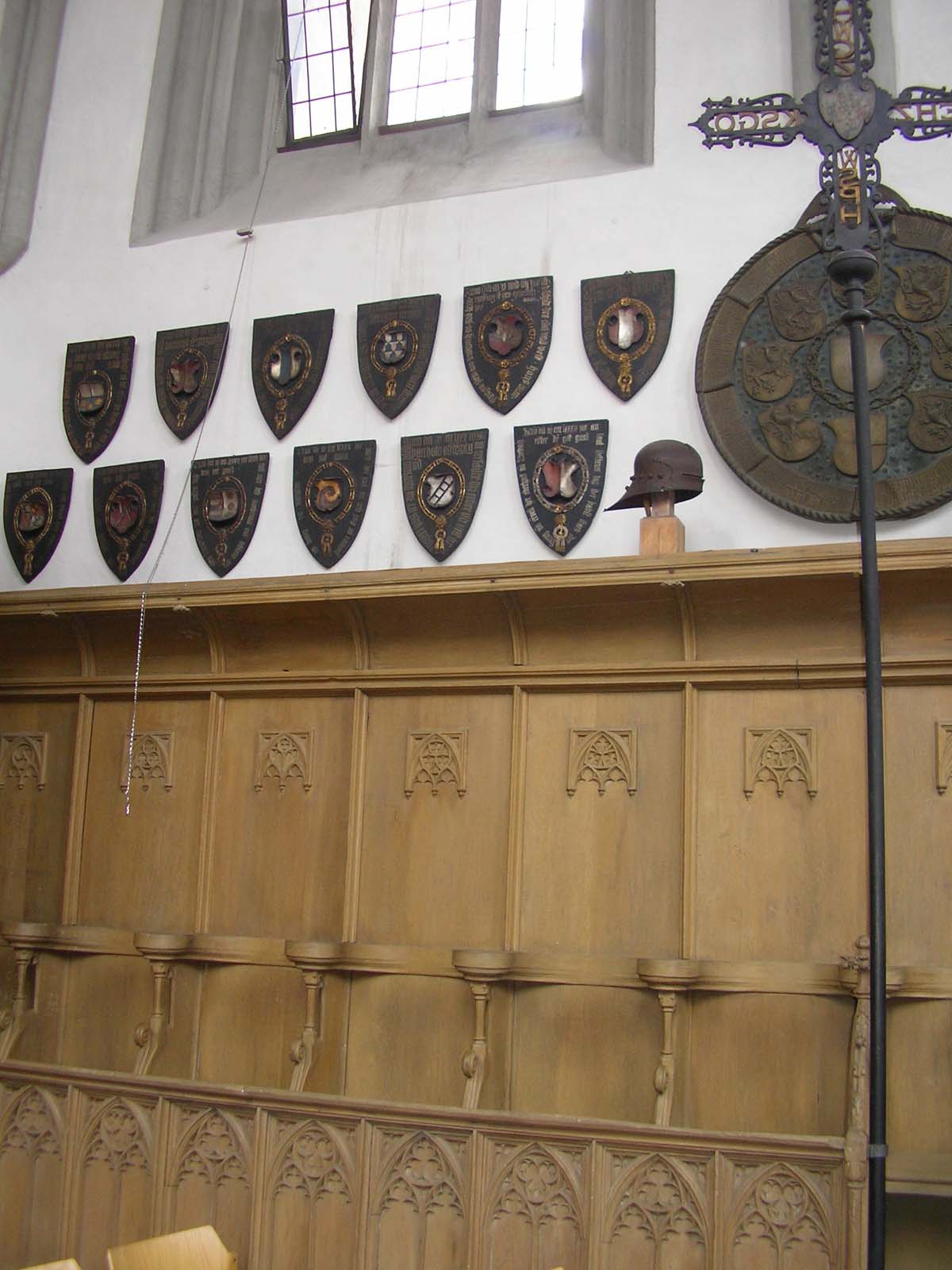 Ovale Totenschilde mit Darstellung des Ordenszeichens in der Schwanenritterkapelle im ehemaligen Ostchor des St Gumbertusstiftes in Ansbach [Fotografie Markus Frankl,Privatbesitz]