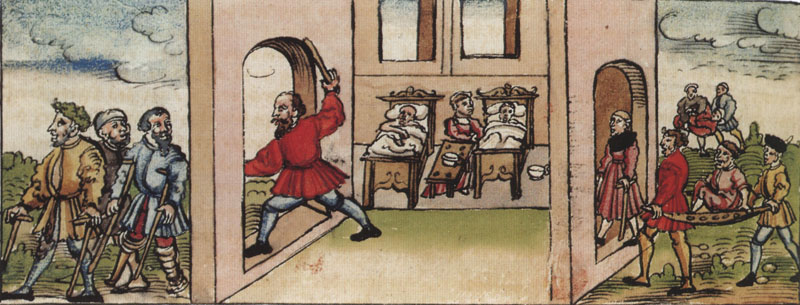 Krankenpflege im Kloster St. Stephan zu Würzburg. Abbildung aus der Würzburger Bischofschronik des Lorenz Fries (ca. 1490-1551) ("Echter-Exemplar"). (UB Würzburg, M.ch.f.760, fol. 83v)