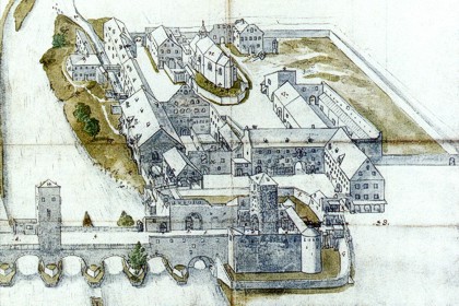 St Katharinenspital in Regensburg, um 1660. (Bayerisches HauptStaatsarchiv, Plansammlung Nr. 11303)