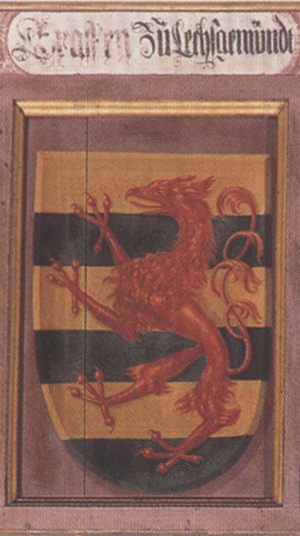 Wappen der Grafen zu Lechsgemünd. Bestandteil einer Tafel mit Wappen von Familien, die sich um das Kloster Kaisheim verdient gemacht haben, um 1500, Öl auf Holz, 45 x 287 cm. (Original: ehemalige Klosterkirche Kaisheim, aus: Werner Schiedermair, Kaisheim - Markt und Kloster [2001], Farb-Abb. 58, 76f., Foto: Philipp Schönborn)