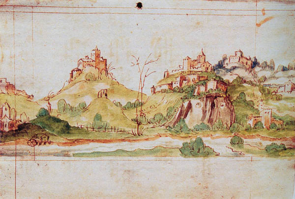 Die Burgen Graisbach und Lechsgemünd, die Stammsitze der Grafen von Lechsgemünd-Graisbach, kolorierte Federzeichnung aus der Chronik des Johannes Knebel (gest. 1532) von 1531, 31 x 15 cm (Blattgröße). (Original: Archiv des Bistums Augsburg, HS 132, Vv)