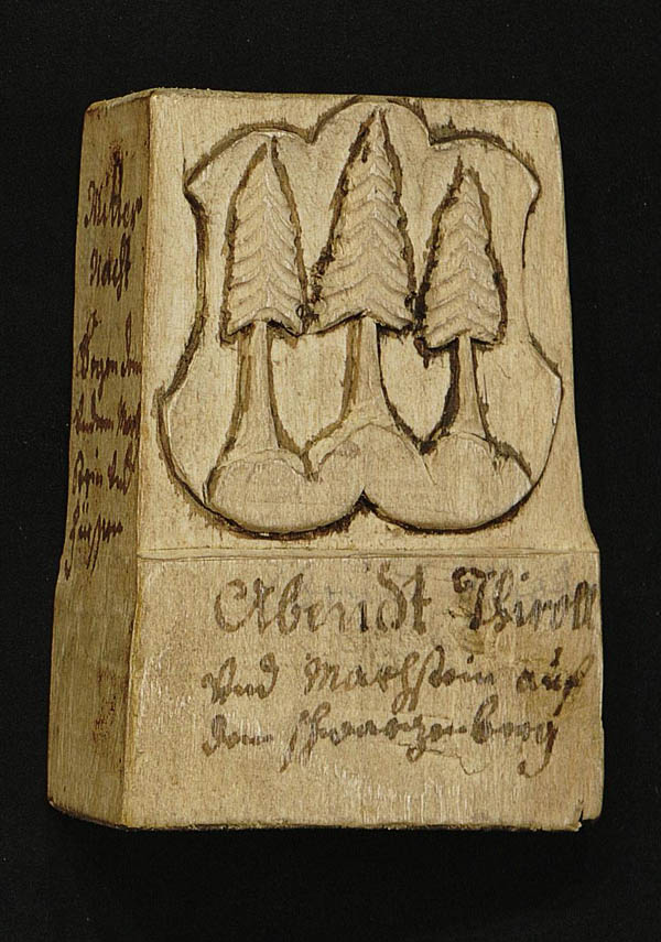 Grenzstein-Bozzetto (Entwurfsmodell 2), der die Grenze zwischen Österreich (Tirol), Kurbayern und dem Hochstift Augsburg kennzeichnet, 1774 nach einer Grenzbegehung entstanden. Die drei Tannen stehen für den Schwarzenberg und weisen auf die österreichische Gerichtsherrschaft Ehrenberg hin. (Holz, 8,5 cm hoch; Staatsarchiv Augsburg, Hochstift Augsburg, MüB 36a)