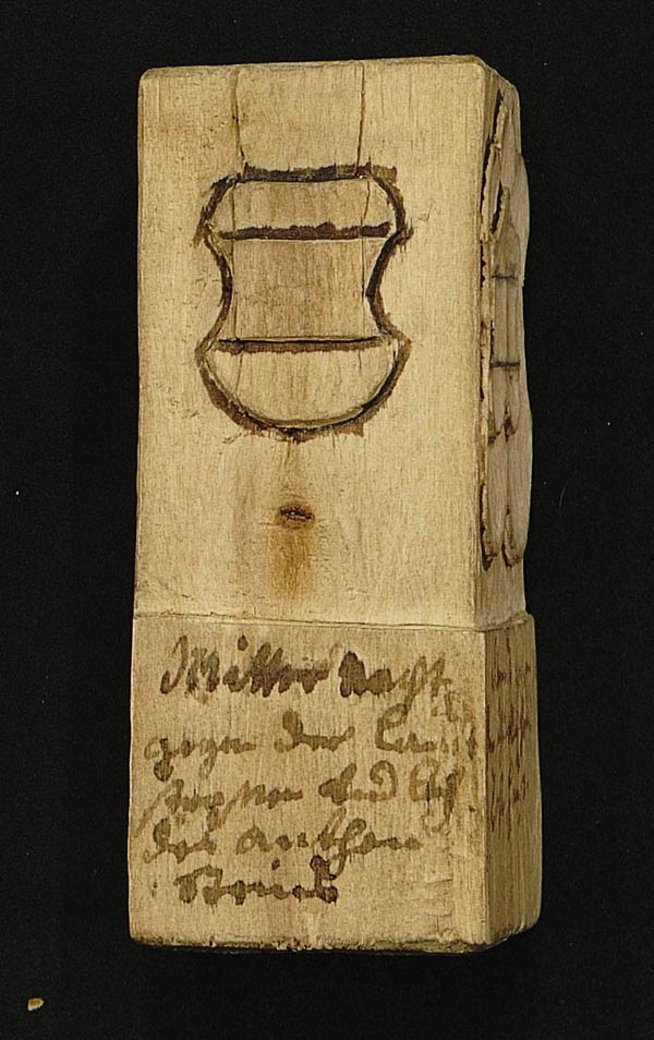 Grenzstein-Bozzetto (Entwurfsmodell 1), der die Grenze zwischen Österreich (Tirol) und dem Hochstift Augsburg kennzeichnet, 1774 nach einer Grenzbegehung entstanden. Zu sehen ist das Wappen Österreichs. (Holz, 8,5 cm hoch; Staatsarchiv Augsburg, Hochstift Augsburg, MüB 36a)