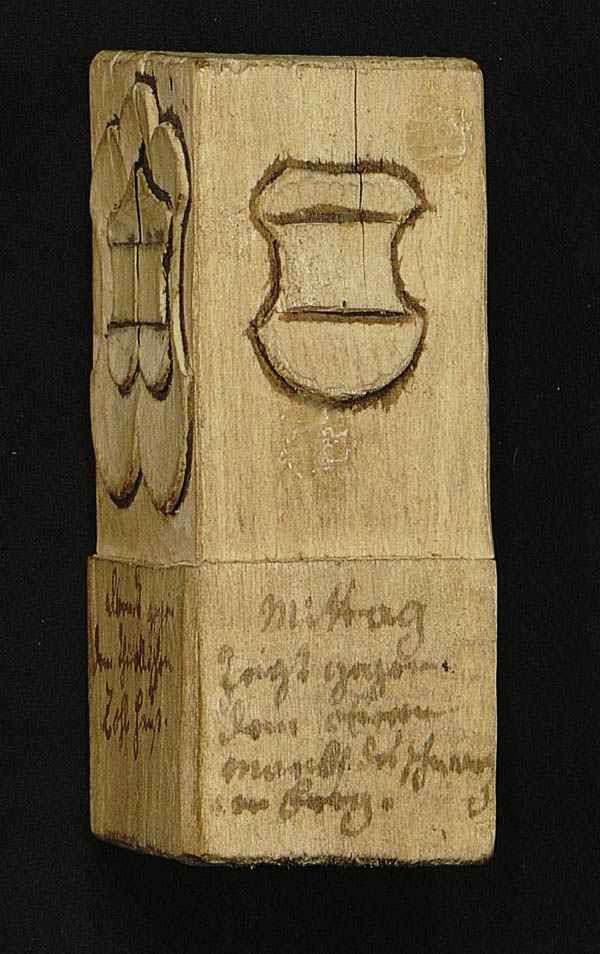 Grenzstein-Bozzetto (Entwurfsmodell 1), der die Grenze zwischen Österreich (Tirol) und dem Hochstift Augsburg kennzeichnet, 1774 nach einer Grenzbegehung entstanden. Zu sehen ist das Wappen Österreichs. (Holz, 8,5 cm hoch; Staatsarchiv Augsburg, Hochstift Augsburg, MüB 36a)