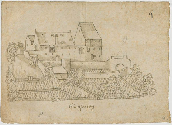 Schloss Gumppenberg um 1560, Federzeichnung von Philipp Apian (1531-1589). (Bayerische Staatsbibliothek Cgm 5379 [3])
