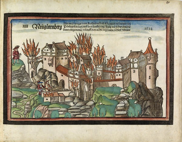 Zerstörung der Burg Neuguttenberg durch Truppen des Schwäbischen Bundes. Holzschnitt von Hans Wandereisen (gest. 1548), 1523. (Staatsbibliothek Bamberg, RB.H.bell.f.1, Seite 19 /Foto: Gerald Raab)