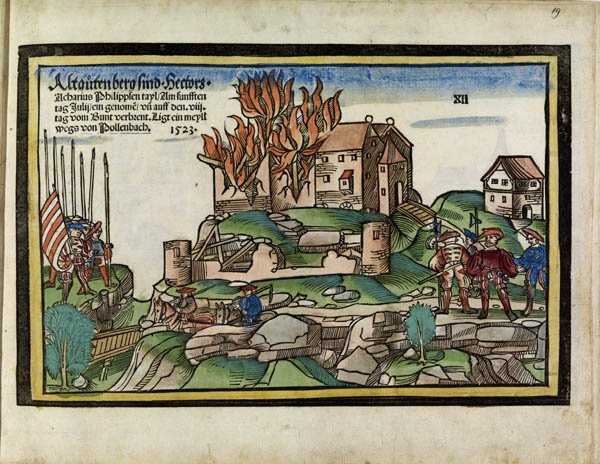 Zerstörung der Burg Altguttenberg durch Truppen des Schwäbischen Bundes. Holzschnitt von Hans Wandereisen, 1523. (Staatsbibliothek Bamberg, RB.H.bell.f.1, Seite 20 /Foto: Gerald Raab)