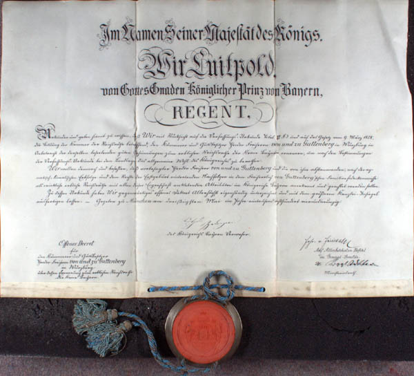 Ernennung des Theodor von Guttenberg zum erblichen Reichsrat der Krone Bayern, 1894. (Staatsarchiv Bamberg, Archiv der von Guttenberg, Urkundenreihe)