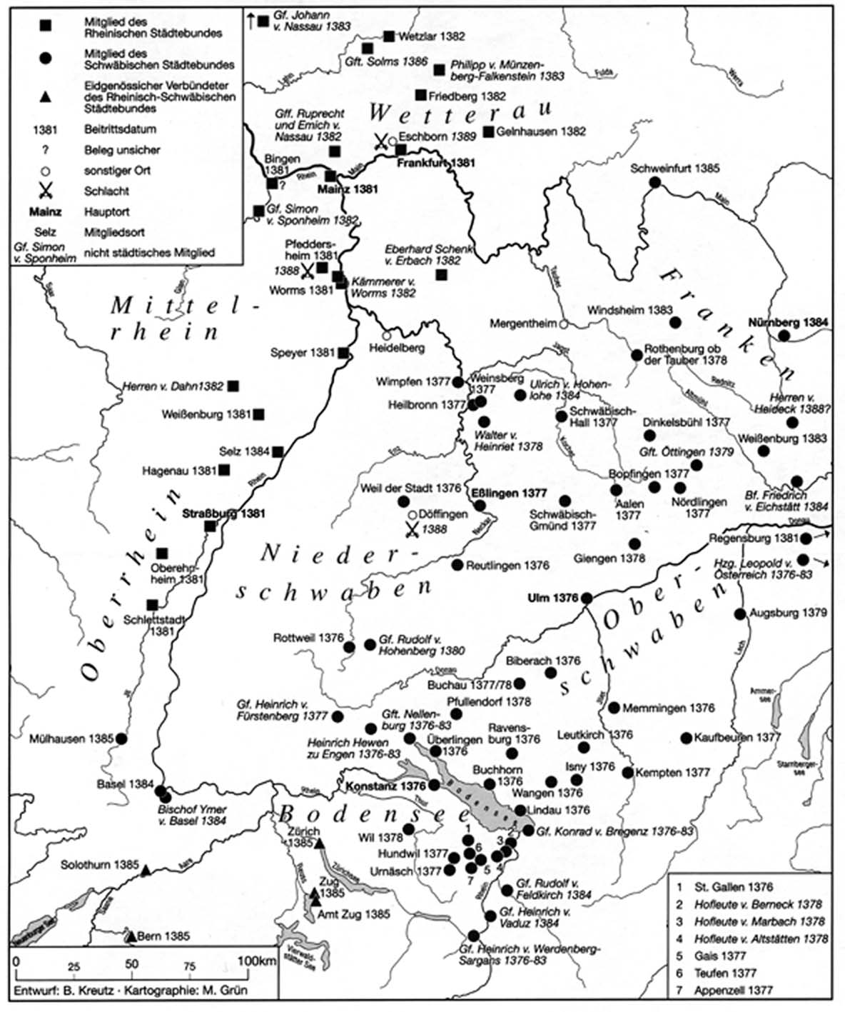 Der Rheinisch-Schwäbische Städtebund 1381-1389. (aus: Berhard Kreutz, Städtebünde und Städtenetz am Mittelrhein im 13. und 14. Jahrhundert [Trierer Historische Forschungen 54], Trier 2005, Karte 4)