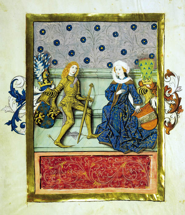 Hans III. von Stauff (gest. 1478) in der von ihm in Auftrag gegebenen Furtmeyr-Bibel (1468-1472), mit Gemahlin Margaret Schenk von Geyern. Die Bibel gelangte während des Löwlerkriegs in den Besitz Herzog Albrechts IV. (reg. 1465-1508), der die ursprünglichen Wappen durch sein eigenes und das seiner Gemahlin Kunigunde von Österreich (1465-1520) ersetzen ließ. (Universitätsbibliothek Augsburg, Cod. I.3.2.4, 1v)