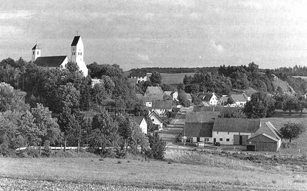 Diemantstein (Markt Bissingen, Lkr. Dillingen). Die Kirche, die auf die Schlosskapelle zurückgeht und 1761 sowie 1876 vergrößerte wurde, steht an der Stelle des 1826 abgebrochenen Schlosses. (Abb. aus: Helmut Lausser, Die Herren von Diemantstein. Ihre Tätigkeiten, Güter und verwandtschaftlichen Beziehungen im Umfeld des Landkreises Dillingen im Mittelalter, in: Jahrbuch des Historischen Vereins Dillingen an der Donau 95 (1993), 34-152, hier: 80)