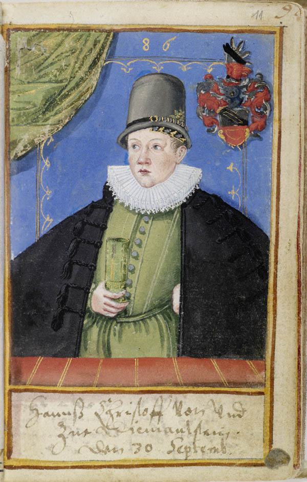 Johann Servatius von Diemantstein (gest. 1612) als Student des protestantischen Gymnasiums in Lauingen 1586. Johann Servatius studierte anschließend im evangelischen Tübingen, trat aber 1597 in die Dienste des Würzburger Bischofs Julius Echter von Mespelbrunn (reg. 1573-1617). Abb. aus dem Stammbuch des späteren Lauinger Bürgermeisters Anton Weihenmayer (1563-1633). (Germanisches Nationalmuseum, Nürnberg, Hs. 123.725, fol. 11r)