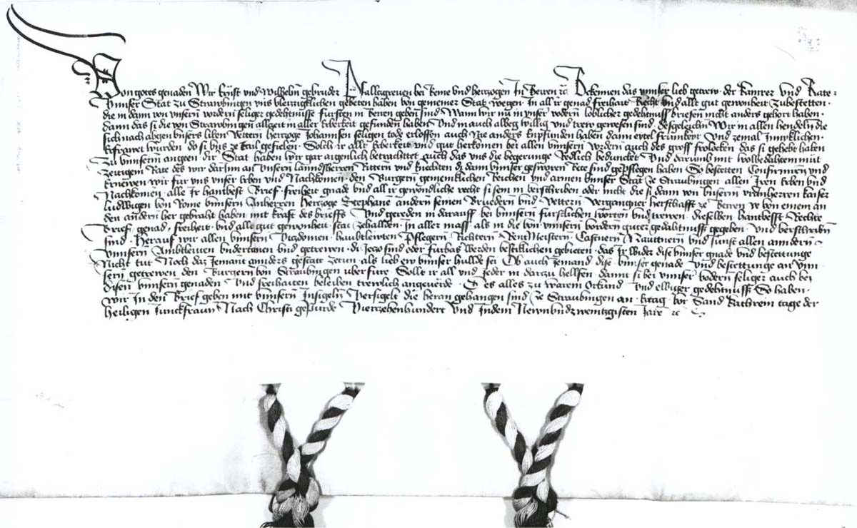 Die Herzöge Ernst und Wilhelm III. bestätigen die Freiheiten der Stadt Straubing und anerkennen ihre Treue und Ergebenheit beim Regierungsantritt, 22. November 1429. (Stadtarchiv Straubing, Urkundensammlung 339)