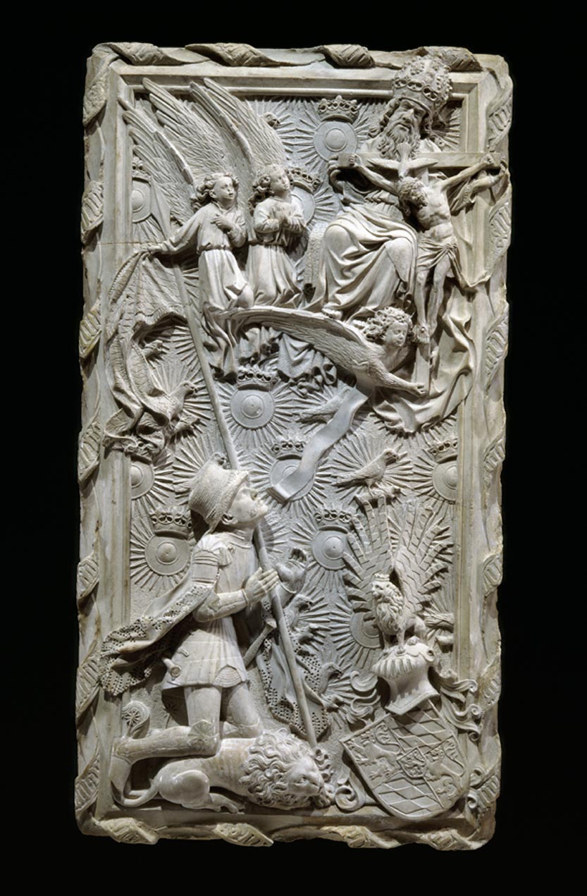 Entwurf für ein Grabmal Herzog Ludwigs VII. von Ingolstadt (reg. 1413-1443), um 1435. Der nicht ausgeführte Entwurf Hans Multschers zeigt in der rechten unteren Ecke das bayerisch-pfälzische Wappen mit einem Herzschild, der den hennegauischen oder holländischen Löwen zeigt. Vermutlich wollte Ludwig damit seinen Anspruch auf das Erbe der Straubinger Linie verkünden. (Foto: Bayerisches Nationalmuseum München)