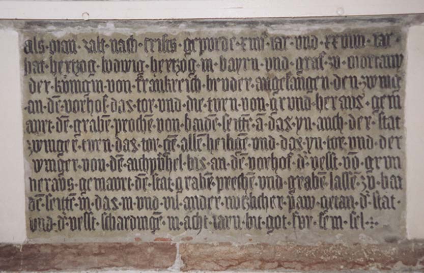 Ludwig VII. von Ingolstadt (reg. 1413-1443) ließ sofort nach Erhalt von Schärding die Burg und Stadtbefestigung erneuern. Hierbei ließ er in der Kirche St. Georg einen Gedenkstein anbringen, der seine Leistung für Schärding festhielt und bis heute ein eindrucksvolles Zeichen seines Besitzanspruches ist. (Stadtarchiv Straubing, Allgemeine Fotosammlung)