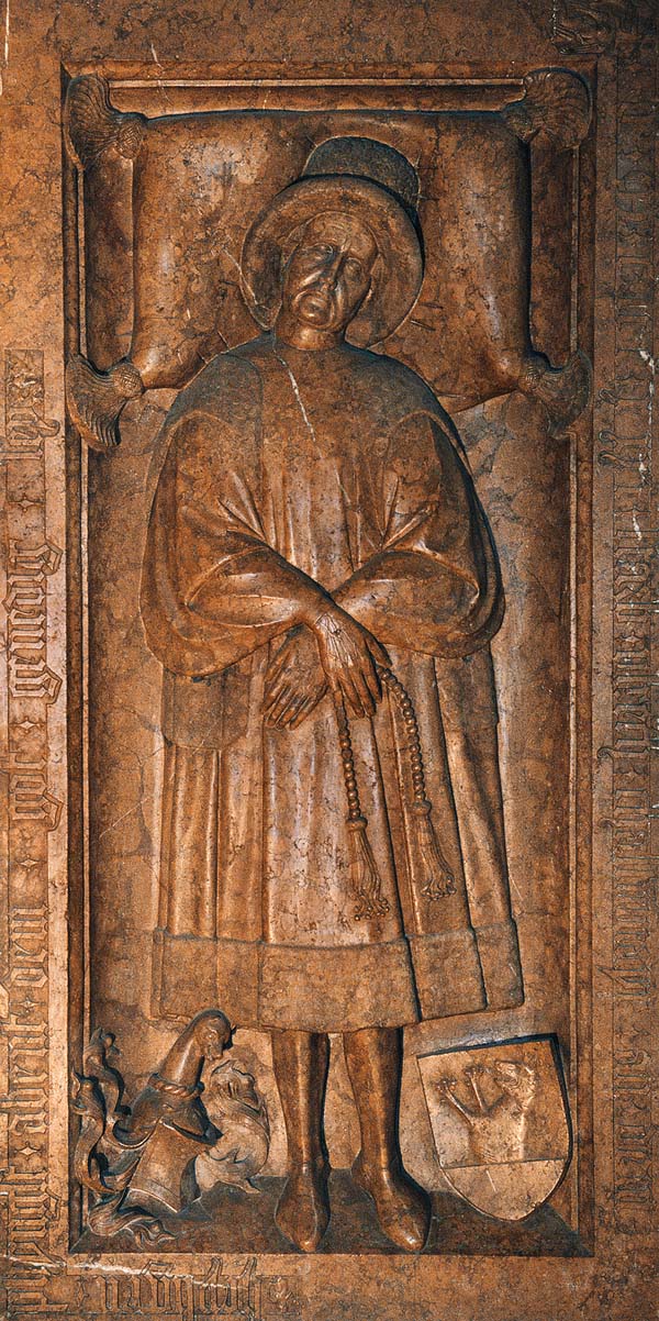 Grabmal für Ulrich Kastenmayr (gest. 1431) in der Kirche St. Jakob in Straubing. Das künstlerisch herausragende Grabmal gab er noch zu Lebzeiten in Auftrag. Der Entwurf könnte von Jan van Eyck (um 1390-1441) stammen. Kastenmayr ist in burgundisch-holländischer Bürgermode abgebildet. (Stadtarchiv Straubing, AllgemeineFotosammlung)
