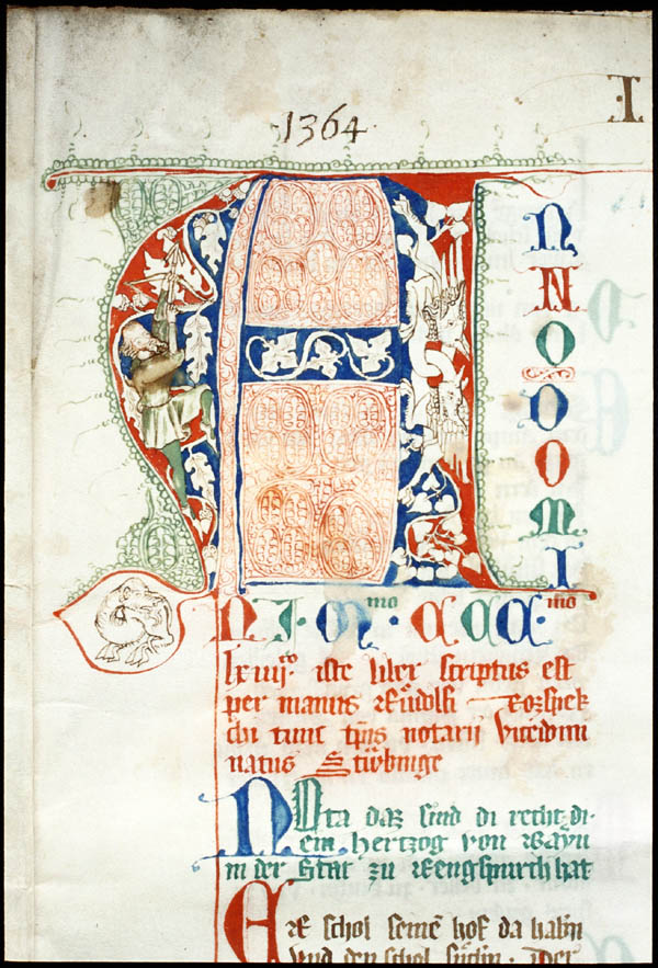 Ausschnitt aus dem Urbarbuch des Herzogtums Niederbayern-Straubing von 1364. Beleg für den hohen Stand von Schrift und Malerei in Straubing. (Bayerisches Hauptstaatsarchiv, Staatsverwaltung1075)