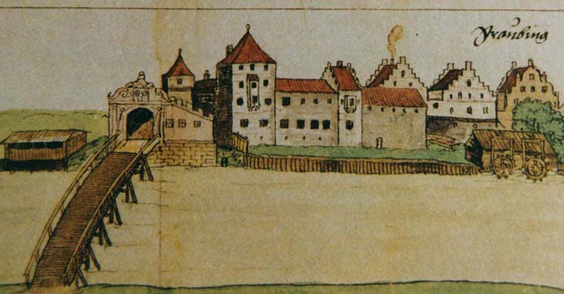 Straubinger Herzogsschloss von Norden. Herzog Albrecht I. gab 1356 ein neues Schloss in Auftrag. Ausschnitt aus einem Plan von Michael Eresinger, 1577. (Bayerisches Hauptstaatsarchiv, Plansammlung2127)