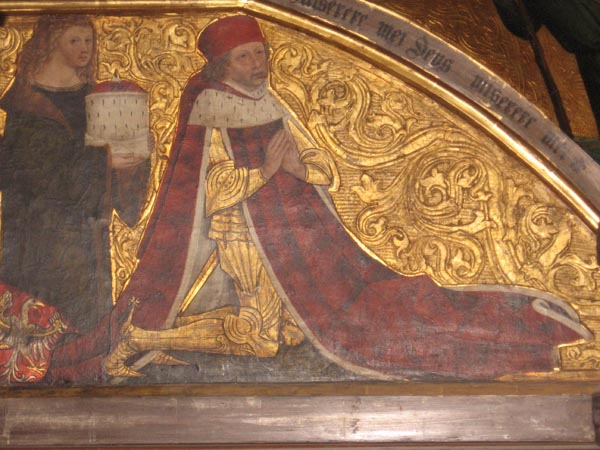Albrecht Achilles (reg. 1440-1486), dargestellt als Markgraf von Brandenburg mit dem Brandenburgischen Wappen. Die Kurwürde symbolisiert der Kurhut, den der kniende Diener hinter ihm hält. Ausschnitt aus der Predella des Schwanenorden-Altars in St. Gumbertus in Ansbach. (Markus Frankl, Würzburg)