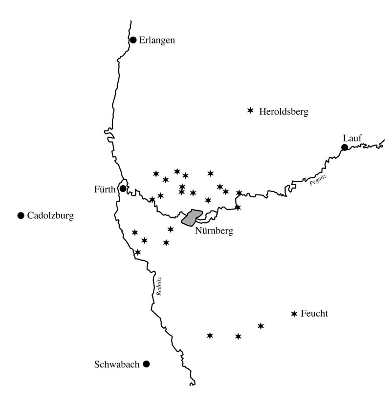 Durch die markgräflichen Truppen zerstörte Orte im Nürnberger Umland am 9. und 10. Juli 1449 nach dem Kriegsbericht Erhard Schürstabs (gest. 1461). Erstellt nach Schürstab: Krieg, 149f. durch Gabriel Zeilinger und Hendrik Mäkeler. Die zerstörten Orte (mit Sternpunkten markiert) waren – beginnend mit Heroldsberg (Lkr. Erlangen-Höchstedt) und endend mit Feucht (Nürnberger Land) – außerdem: Ziegelstein, Erlenstegen, Spittelhof, Schefhof, Schoppershof, Mögeldorf, Großreuth, Kleinreuth, Thon, Lohe, Schnepfenreuth, Almoshof, Höfles, Wetzendorf, Schniegling, Gebersdorf, Sündersbühl, Schweinau, Kornburg, Röthenbach (alle Gemarkungen der Stadt Nürnberg), Groß- und Kleinreuth (nun die beiden Siedlungen südlich der Pegnitz) und Wendelstein (Lkr. Roth). Der Gostenhof wurde vom Nürnberger Rat selbst 'vorsorglich' zerstört. (in: Gabriel Zeilinger, Lebensformen im Krieg, Stuttgart 2007, 91)