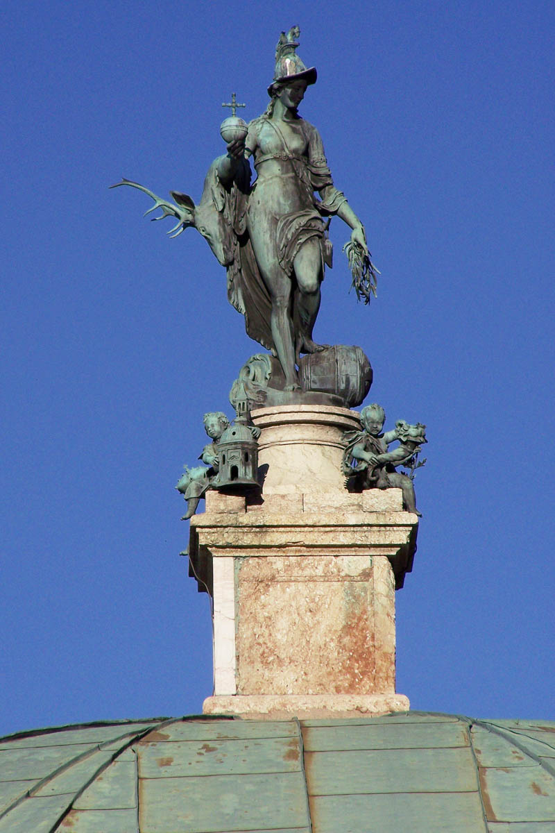 Die "Tellus Bavarica", eine Allegorie der bayerischen Erde, auf dem Dianatempel im Hofgarten in München. Die Figur ist mit Symbolen des wirtschaftlichen Reichtums Bayerns versehen: Jagd, Fischerei, Ackerbau und Salz; symbolisiert durch Hirschfell, Reuse, Ährengarbe und Salzfass. Ebenfalls trägt die Figur den Kurapfel. Ursprünglich wurde die Figur von Hubert Gerhard (gest. um 1620) als Dianastatue konstruiert, Hans Krumpper (ca. 1570-1634) gestaltete sie 1623 um. Das Original der Figur befindet sich heute in der Münchner Residenz; im Hofgarten ist eine Kopie zu sehen. (Foto: privat)