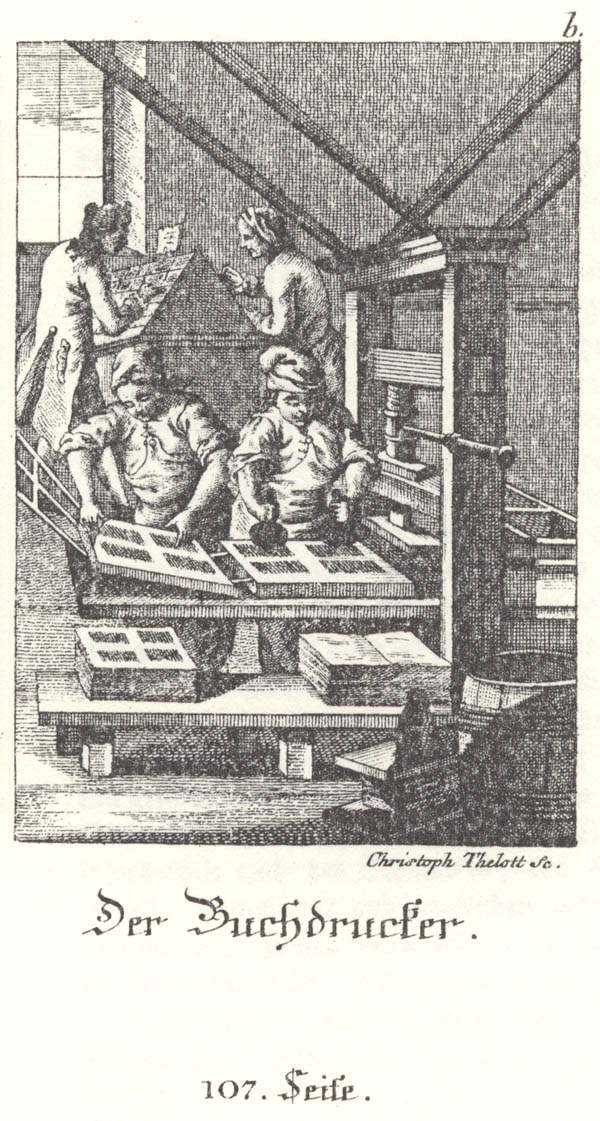 Der Buchdrucker, Tab XXXVII b, 107 Seite [aus: Paul von Stetten, der Mensch in seinen verschiedenen Lagen und Ständen für die Jugend geschildert, Nachdruck Nördlingen1998]