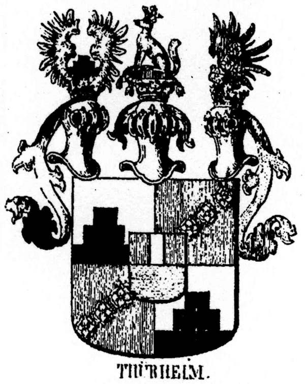 Wappendarstellung der Thürheim. (Abb. aus: Otto Titan von Hefner/Gustav Adalbert Seyler, Die Wappen des bayerischen Adels [J. Siebmacher's großes Wappenbuch. 2. Band, 1. Abt.], Nürnberg 1856)