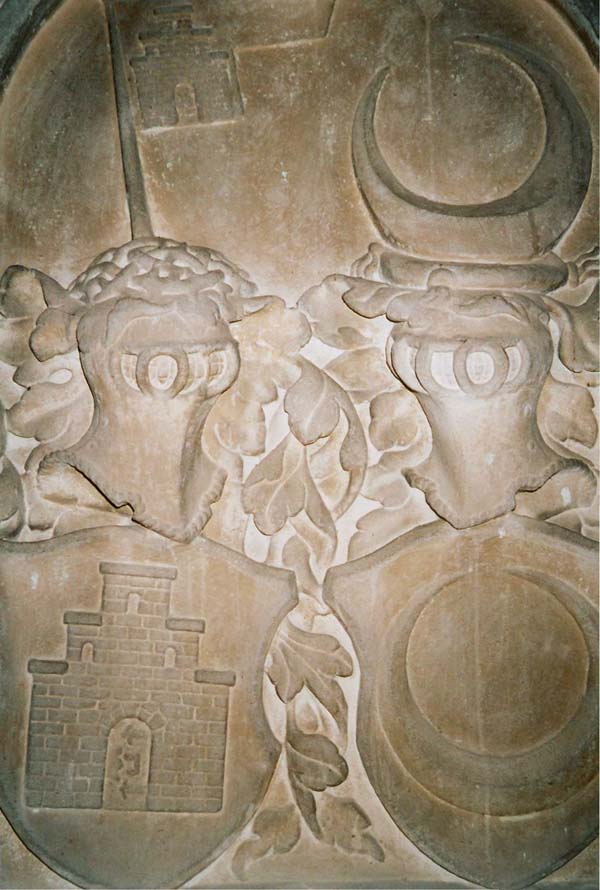 Detailansicht aus dem Epitaph für Sibylla von Thürheim, Pfarrkirche Biberachzell (Lkr. Neu-Ulm; 1567) - mit Wappen der Familien Thürheim (Burg mit Tür) und Wellwarth (Mond). (Foto: privat)