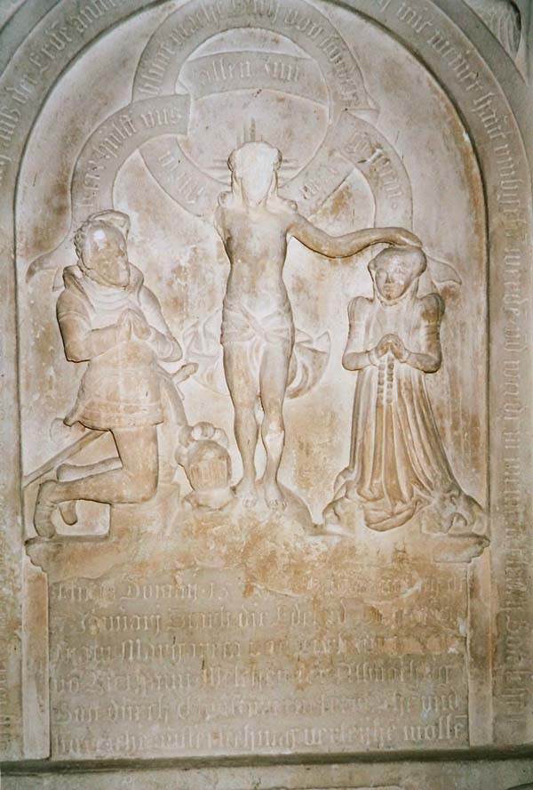 Epitaph für Margareta von Thürheim, geborene von Rietheim, 1578 (Künstler: Hans Schaller). Die Abbildung zeigt Margareta mit ihrem Gemahl Johann Wilhelm von Thürheim (gest. 1583), dazwischen der auferstandene Christus. (Foto: privat)