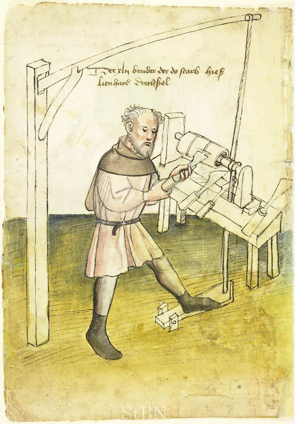 Bildnis des Drechslers Lienhard Drechßel im ältesten Bestand des Hausbuchs der Mendelschen Zwölfbrüderstiftung. Es handelt sich gleichzeitig um eine der frühesten Bildquellen, die eine Wippendrehbank zeigen. (Stadtbibliothek Nürnberg, Amb. 317.2°, f. 18v)
