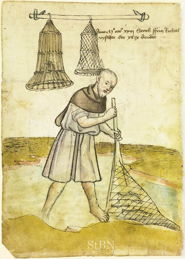 Das Bild des Fischers Fritz Richtel von 1426 ist auch die älteste Darstellung einer Netzreuse (rechte Reuse). (Stadtbibliothek Nürnberg, Amb. 317.2°, f. 47v)