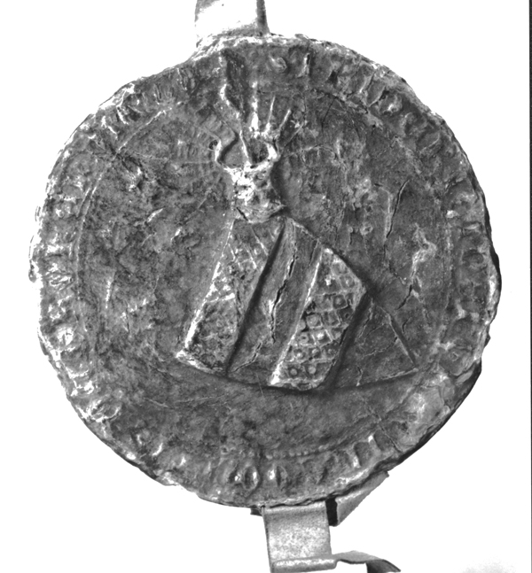 Das Siegel Friedrichs V. von Truhendingen zeigt 1287 neben dem Wappen auch einen Helm mit Stierhörnern und Pfauenbusch. (Staatsarchiv Nürnberg, Fürstentum Brandenburg-Ansbach, Urkunden vor 1400 [Münchner Abgabe 1992], Nr. 171)