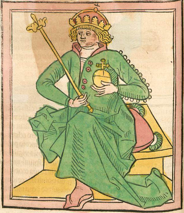 Karl von Anjou (1288-1342, 1301-1342 ungarischer König) in der Brünner Ausgabe der Chronica Hungarorum von Johannes Thurocz (gest. 1490). (Bayerische Staatsbibliothek, Inc.c.a. 2125, fol. 56v)