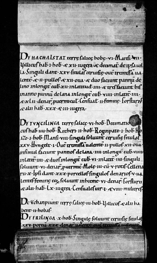 Den heute verschollenen Güterrotulus von St. Emmeram aus dem Jahr 1031 führten wahrscheinlich die Klosterbeamten auf Rundreisen durch den Klosterbesitz als Revisionsgrundlage mit sich. Aus: Verhandlungen des Historischen Vereins für Oberpfalz und Regensburg 106 (1966), zwischen 88/89. (Foto: Bayerisches Hauptstaatsarchiv)